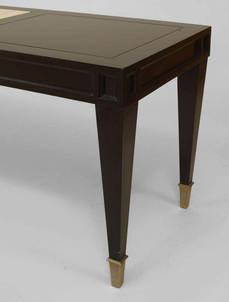 Antique french marquetry inlaid coffee table thick marble top brass gallery rail.
